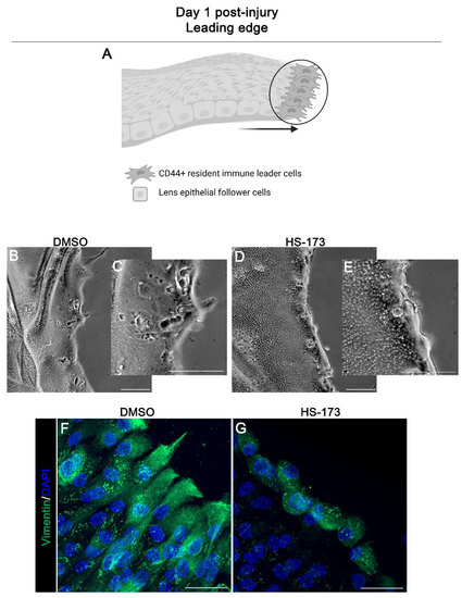 To examine the mechanism of how p110α promotes collective migration following wounding we determined the specific effects of blocking p110α on the function of resident immune cells at the leading edge of the cataract surgery wound. Our previous studies showed that the leader cells, a vimentin-rich cell population, play an essential role in mediating lens post-cataract surgery wound healing, and that vimentin function is required for their extension of lamellipodial processes along the basement membrane substrate [26]. Here, we investigated the impact of blocking p110α function on vimentin-rich lamellipodial extension by leader cells (modeled in Figure 2A). Ex vivo post-cataract surgery cultures were exposed to the HS-173 inhibitor to block p110α from day 0 through day 1 post-wounding and compared to vehicle DMSO treated controls. The extension of processes by leader cells was examined by both phase microscopy imaging (Figure 2B–E) and by confocal microscopy imaging after immunolabeling for vimentin (Figure 2F,G). Phase contrast images show that the HS-173 p110α inhibitor blocked extension of normal protrusions by leader cells at the wound edge on day 1 (Figure 2B–E). Immunolabeling for the cytoskeletal protein vimentin highlights this failure to extend lamellipodial processes along the substrate (Figure 2G, HS-173) that are normally rich in vimentin (Figure 2F, DMSO). In the presence of HS-173 the leader cells at the at the wound edge remained round (Figure 2G).