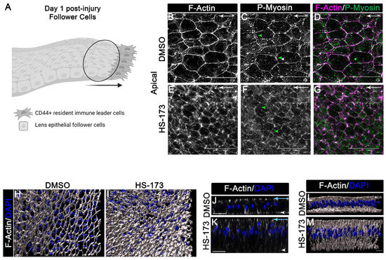 To examine the mechanism of how p110α promotes collective migration following wounding, we determined the specific effects of blocking p110α on the wounded lens epithelium, the follower cells in our culture model. Our previous studies show that actomyosin mechanical cues are critical for the organization of the wounded lens epithelial cells within the collectively migrating monolayer [7]. Active (phospho) myosin was found to localize to apical junctional complex that maintains cell–cell contact between wounded epithelial cells [7]. At the same time, the organization of actin stress fibers is induced along the basal cell compartment of the migrating epithelium where it is linked to cadherin junctions that are located in cryptic lamellipodia. This mechanical coupling is driven by active myosin to promote movement of the epithelium along the substrate [7]. Here, we investigated whether p110α signaling has a role in the regulation of apical and/or basal actomyosin organization in the wounded lens epithelial cells (modeled in Figure 5A). For these studies, ex vivo wounded cultures were treated with vehicle (DMSO) or the p110α inhibitor, HS-173 on day 0 through day 1 (Figure 5). The wounded explant cultures were immunolabeled for active myosin using an antibody that recognizes dually phosphorylated (Thr18/ser19) regulator light chain (RLC) of myosin II (Figure 5C,D,F,G; Figure 6B,C,E,F,H,I) and co-labeled for F-actin with fluorescent-conjugated phalloidin (Figure 5B,D,E,G,H–M; Figure 6A,C,D,F,G,I). Confocal z-stacks were acquired to determine changes in actomyosin organization and/or myosin activity along the apical (Figure 5B–G,J–M) and basal (Figure 6) domains of the wounded lens epithelial follower cells.