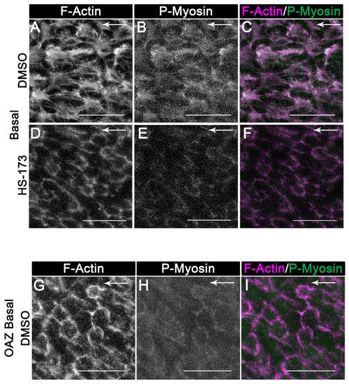 While inhibiting p110α signaling did not affect the distribution of apical F-actin, the wound-induced organization of basal actin structures was blocked (Figure 6A compared to Figure 6D). In vehicle controls, F-actin stress fibers were induced to form that co-localized with active (phospho) myosin (Figure 6A–C). These actomyosin filaments are expected to be linked to N-cadherin that localization to cryptic lamellipodia [7], and propel the wounded epithelial follower cells along the basal substrate. In the HS-173 treated wounded explants F-actin maintained a cortical distribution and at these cell–cell contacts F-actin was co-localized with active myosin (Figure 6D–F). Interestingly, the cortical distribution of actin along the basal surfaces of the wounded epithelial cells with HS-173 treatment parallels that of wounded epithelial cells located in the OAZ at time 0 post-injury ([7], Supplemental Figure S2B). Additionally, for comparison, confocal images of wounded epithelial cells from the OAZ of vehicle control were imaged along their basal surfaces at day 1 post-injury following labeling for F-actin and active myosin (Figure 6G–I). In contrast to wounded lens epithelial cells migrating across the cell-denuded basement membrane of the CMZ, F-actin and active myosin were distributed cortically in the wounded lens epithelial cells that remain associated with the OAZ (Figure 6G–I). These results show that lens epithelial follower cells treated with HS-173 share a similar cortical organization of actomyosin along their basal surfaces as the nonmotile, wounded lens epithelial cells in the OAZ of vehicle controls. These findings suggest that p110α signaling is needed to induce reorganization of actomyosin along the basal domains of the wounded epithelial cells for collective migration during wound healing.