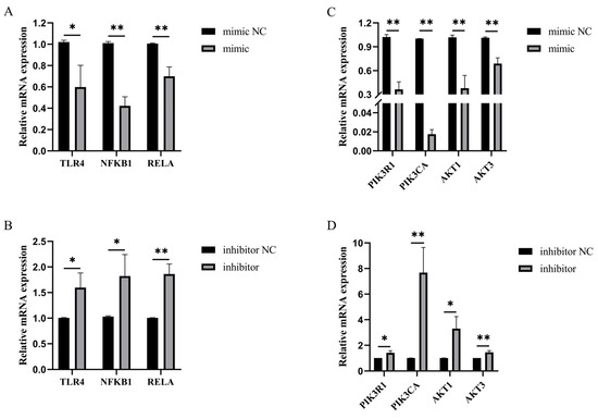 The overexpression of bta-miR-199a-3p inhibited the LPS-induced mRNA expression of TLR4, NFKB1 (p50), RELA (p65), AKT1, AKT3, PIK3CA, and PIK3R1 in the MAC-T cells, compared to the mimic NC group (Figure 9A,C). The silencing of bta-miR-199a-3p produced the opposite results (Figure 9B,C), suggesting that bta-miR-199a-3p might inhibit LPS-induced activation of the PI3K/AKT/NF-κB pathway. Western blot experiments were performed to further verify the above inference, confirming that the overexpression of bta-miR-199a-3p inhibited the expression of PI3K, AKT, and p-p65 proteins (Figure 9E,F). However, the silencing of bta-miR-199a-3p promoted the expression of the proteins (Figure 9E,G). In summary, all the above results indicate that bta-miR-199a-3p inhibits the activation of the PI3K/AKT/NF-κB signaling pathway in LPS-induced inflammation in MAC-T cells.