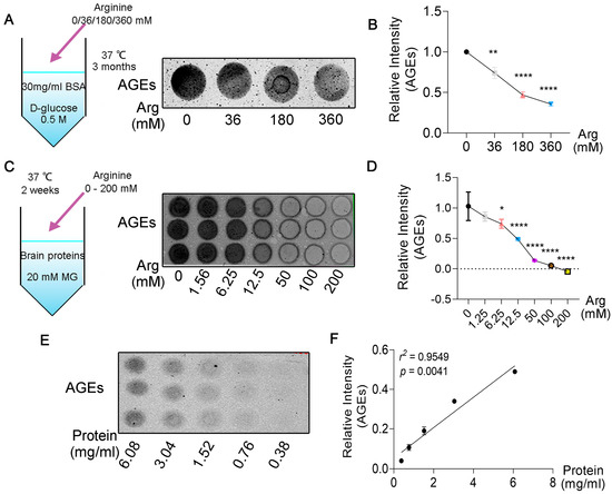 Arginine decreases the glycation of proteins in a dose−dependent manner. (A,B) Bovine serum albumin (BSA, 30 mg/mL) and D−glucose (0.5 M) were incubated with L−arginine (0, 36, 180, 360 mM) at 37 °C for 3 months. Dot blot was used to measure the level of glycation with antibody against AGEs. (C,D) Mice brain proteins (13.5 mg/mL), methylglyoxal (MG, 250 mM) were reacted with L−arginine (0, 1.56, 6.25, 12.5, 50, 100, 200 mM) at 37 °C for a fortnight. Dot blot was performed. (E,F) Sequentially diluted samples from (C) (proteins + MG + Arg (6.25 mM)) were detected through dot blot with antibody against AGEs and assessed by correlation analyses. Significant correlation (r2 = 0.9549, p = 0.0041). Data are exhibited as mean ± SD (n = 3). (B,D) statistical analysis with one−way ANOVA with a post hoc Turkey’s test. * p < 0.005, ** p < 0.001, **** p < 0.0001 vs. 0−Arg group.