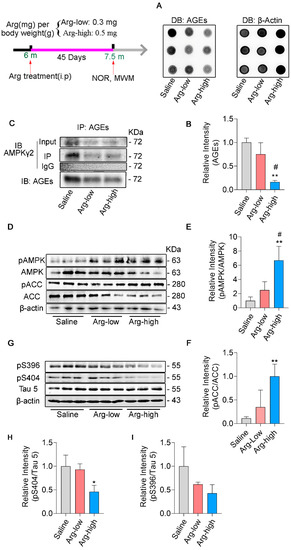 Arginine defends γ2 subunit of AMPK against its glycation and improves AMPK function in 3 × Tg mice. The hippocampi were extracted from 3 × Tg Saline group (Saline), 3 × Tg Arg−low group (Arg−low), 3 × Tg Arg−high group (Arg−high) at 7.5−month−old. (A,B) The levels of hippocampal AGEs were examined by dot blot with antibody against anti−AGEs. (C) Dissected hippocampi were immune−precipitated with antibody against AGEs and then examined by western blot with antibody against AMPK γ2. (D–I) The expressions of AMPK, pT172−AMPK, pS79−ACC, ACC, Tau 5, pS396, and pS404 were examined by western blot. All data were exhibited as the means ± SD (n = 3), statistical analysis with one−way ANOVA with a post hoc Turkey’s test. * p < 0.05, ** p < 0.01 vs. Saline group, # p < 0.05 vs. Arg−low group.