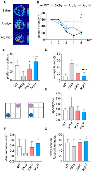 The hippocampus is one of the key elements in spatial learning and memory [45]. Comprehensive studies have shown hippocampal−dependent spatial learning and memory are deeply destroyed in 3 × Tg mice. Morris Water Maze (MWM) and the object location task are behavior tests to evaluate cognitive abilities [46]. The MWM data indicated that the escape latency time of Arg groups was significantly shorter than Saline group at day 5 during the 5 days of consecutive training, which illustrated arginine treatment alleviated learning ability damage of 3 × Tg mice (Figure 5B). The probe trial elicited higher platform crossings in the Arg groups compared to the Saline group (Figure 5C) as well as shorter escape latency (Figure 5D). Swimming speeds among all the groups were comparable, which indicated that these differences are independent of speed factor. (Figure 5E). Similarly, we conducted an object location task on these objects. Aligned with the MWM test, the Arg group showed remarkable amelioration in cognitive impairments, shown by the higher exploring time with the object in a new location (Figure 5G). These data support administration of arginine as effective for rescuing cognitive deficits in 3 × Tg mice.
