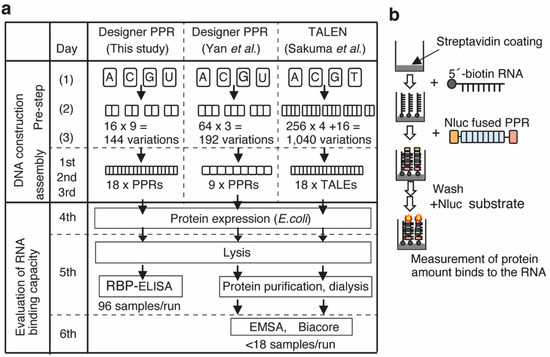 To reduce the time and effort required to construct designer RNA-binding proteins, including designer PPR proteins, we built a 96-well-plate-based construction and evaluation system. Using this rapid system, 100 designer PPR proteins were obtained in six days. This system enables the design, construction, and evaluation of designer PPR scaffolds using hundreds of the test PPR molecules. In addition, acquiring biochemical characteristics prior to analysis in cells or individuals would provide significant advantages with respect to understanding the mechanism, which is difficult for nucleotide-based technologies. In principle, the RBP-ELISA system can be applied for the analysis of other RNA- and DNA-binding proteins.