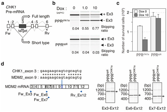 Total RNA was extracted using a Maxwell® RSC simplyRNA Cell Kit (Promega, Madison, WI, USA), according to the manufacturer’s instructions. cDNA was generated in a 20 µL reaction mixture containing 5 µL total RNA (500 ng), 0.5 µL 100 µM oligo dT20 primer, 0.5 µL 10 mM dNTPs, 0.5 µL 0.1 M DTT, 0.5 µL 5× reaction buffer, 0.5 µL D.W., and 0.5 µL Superscript III (Invitrogen). The mixture was incubated at 50 °C for 30 min and then heated at 85 °C for 10 min to inactivate the reverse transcriptase. The cDNA was stored at −20 °C until use. To determine the influence of splicing efficiency by rPPR, PCR was performed with RG6Fw (5′-CAAAGTGGAGGACCCAGTACC–3′) and RG6Rv (5′-GCGCATGAACTCCTTGATGAC–3′) for the RG6 reporter assay, 5′-CHK1_F1 (CTCGGTGGAGTCATGGCAGTG–3′) and CHK1_R1 (5′-CATCTTGTTCAACAAACGCTCACG–3′) for the CHK1 exon 3 skipping assay, and MDM2_Ex3_Fw (5′-CGCGAAAACCCCGGATGGTGAG–3′) or MDM2_Ex6_Fw (5′-CATGATCTACAGGAACTTGGTAGTAGTC–3′) or MDM2_Ex7_Fw (5′-GAGAACAGGTGTCACCTTGAAGGTGG–3′) and MDM2_Ex12_Rv (5′-ATTCATTTCATTGCATGAAGTGCATTTCC–3′) for the MDM2 exon 9 skipping assay, using PrimeSTAR GXL DNA polymerase (Takara-bio, Shiga, Japan). The PCR product was analyzed using MultiNA (SHIMADZU, Kyoto, Japan) with a DNA 1000 kit (SHIMADZU, Kyoto, Japan). The ratio of exon skipping was calculated as the band intensity of the exon-skipped RNA divided by the sum of the exon-skipped and included RNAs.