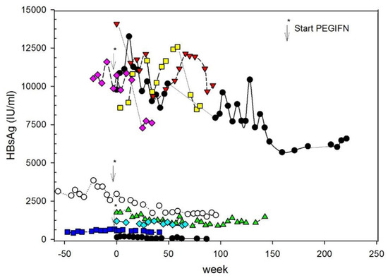 Serial measurement of qHBsAg on the treatment with Bulevirtide. In some patients, PEGIFN-alfa2a was added (the start is shown by the arrow) [23].