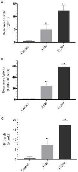 3.1. H1299 Cell Media Had Higher Heparanase Levels and Activity and Higher Levels of HS Than the Media of A549 Cells