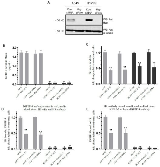 To examine the binding of IGFBP-3 to HS, ELISA plate wells were coated with IGFBP-3 antibodies followed by addition of media obtained from cells untreated or treated with either OGT 2115, control-, or heparanase-siRNA. The amount of HS bound to IGFBP-3 was then detected using anti-HS specific antibodies (Figure 2D). Conversely, HS antibodies were coated in the wells followed by incubation with the same media samples, and then detection of IGFBP-3 was carried out using anti-IGFBP-3 specific antibodies (Figure 2E). In both cases, there was a ~2.0-fold decrease in the binding of HS to IGFBP-3 in the media of A549 cells (Figure 2D,E). As expected, no effects were observed in the media of H1299 cells on HS-IGFBP-3 binding since they are IGFBP-3-negative (Figure 2D,E). An interpretation of these results might be that blocking heparanase activity or expression decreases the levels of soluble HS fragments, consequently leading to decreased binding between IGFBP-3 and HS in the media.
