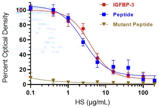 Increasing HS concentrations blocked binding of HA to IGFBP-3 and WT- but not the mutant-peptide. IGFBP-3 protein, WT-, or mutant-peptide (50 nM) were bound to the plate wells. A single concentration of biotinylated-HA (35 µg/mL) was incubated for 1h without or with increasing concentrations of HS and then loaded into the coated wells. The signal was then processed, and the bound biotinylated-HA was then detected as described in the Materials and Methods section. Prior to data analysis, the OD were corrected for non-specific binding by subtracting the mean background absorbance for the negative controls prepared with all components except biotinylated-HA. Optical density measurements (450 nm) were normalized by expressing each point in relation to the best-fitted Emax value for IGFBP-3 (set to 100%). The data were then plotted as a function of increasing HS concentrations. Using the GraphPad Prism 9.4.1 software, the data were analyzed with a nonlinear regression curve fitting approach then expressed as the mean ± S.D. of three independent experiments, each carried out in triplicate.