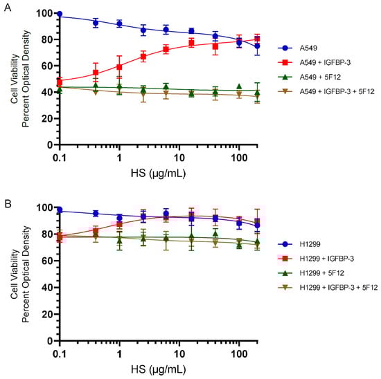 Increasing HS concentrations reduced A549 cell viability by ~25% at the highest concentrations used (Figure 4A) while that decrease was ~13.5% in H1299 cells (Figure 4B). Incubation of cells with IGFBP-3, 5F12, or in combination, decreased A549 cell viability by ~55% (Figure 4A) and H1299 cell viability by ~22.5% (Figure 4B). Cell viability was restored upon addition of HS to either cell line treated with only IGFBP-3 but not in cells treated with either 5F12 or a combination of 5F12 and IGFBP-3 (Figure 4). These results might suggest that HS binds IGFBP-3 and blocks its interactions with HA, allowing HA–CD44 signaling to occur, restoring cell survival. These results might also provide further support to the hypothesis that IGFBP-3 operates via disrupting HA–CD44 interactions since blocking this interaction by the 5F12 antibody abolished the ability of HS to alter IGFBP-3-induced effects on cell viability.