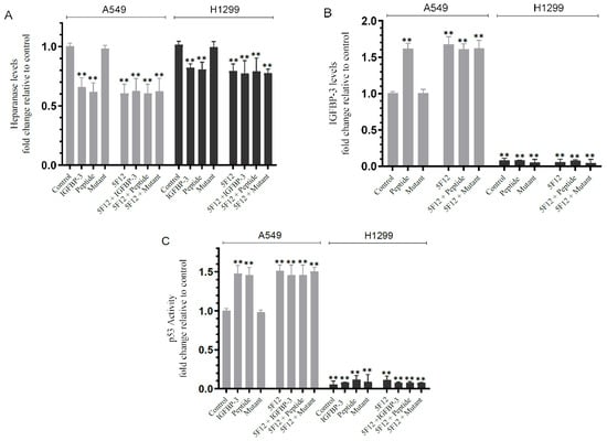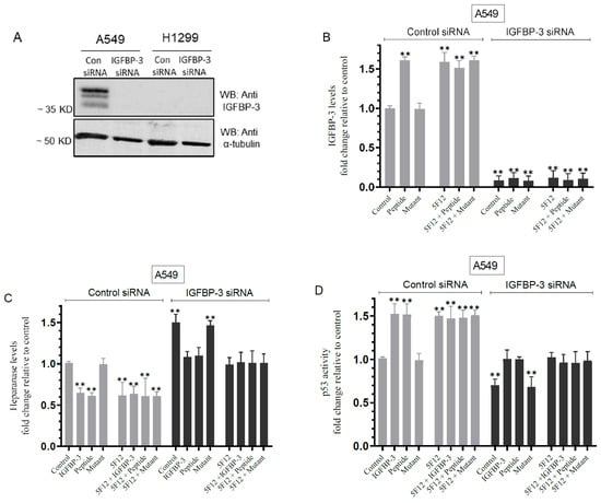A549 cell treatment with IGFBP-3 siRNA effectively reduced the levels of the protein (Figure 7A,B). Consistent with the results shown in Figure 5 and Figure 6, treatment of A549 cells with the IGFBP-3 peptide, but not the mutant, or 5F12 in the absence or presence of peptide or mutant led to a ~1.60-fold increase in the levels of IGFBP-3 in the media (Figure 7B) and a ~1.55-fold decrease in the levels of heparanase in the media (Figure 7C). Transfection of A549 cells with IGFBP-3 siRNA led to a ~1.50-fold increase in heparanase levels in the media (Figure 7C). Treatment of A549 cells transfected with IGFBP-3 siRNA with the IGFBP-3 protein, peptide, 5F12, or in combination, decreased the levels of heparanase by ~1.45-fold (Figure 7C). In contrast to the results obtained with heparanase (Figure 7C), p53 activity was increased by ~1.50-fold in A549 cells transfected with control siRNA and treated with either the IGFBP-3 protein, peptide, 5F12, or in combination (Figure 7D). Transfection of A549 cells with IGFBP-3 siRNA decreased the activity of p53 by ~1.45-fold and treatment of those cells with the IGFBP-3 protein, peptide, 5F12, or in combination increased the activity of p53 by ~1.45-fold (Figure 7D).