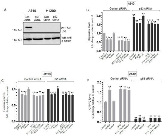 To investigate the effect of p53 knockdown on the levels of heparanase and IGFBP-3, cells were grown in FBS-supplemented media overnight then serum-starved for 24 h. The cells were then transfected as indicated with control siRNA or p53 siRNA (Figure 6A) with or without treatment using IGFBP-3 protein, peptide, or mutant peptide, the CD44 antibody (5F12), or in combination (Figure 6B–D). The levels of heparanase and IGFBP-3 were then measured in the media as described in the Materials and Methods section.