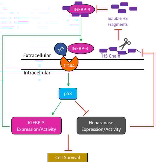 Representation of the main hypothesis and findings from this study. Binding of IGFBP-3 to HA blocks HA–CD44 signaling leading to p53 activation which in turn results in increased IGFBP-3 levels. IGFBP-3 is now able to continue disrupting HA–CD44 signaling further increasing its own levels. Increased p53 activation resulting from disruption of HA–CD44 signaling by IGFBP-3 also leads to decreased heparanase levels and activity, blocking the enzyme’s ability to cleave cell-surface HS chains, decreasing soluble HS fragments, and formation of the IGFBP-3-HS complex. IGFBP-3 not bound to HS is now able to bind HA disrupting HA–CD44 signaling decreasing cell survival. Green lines/arrows indicate activation while red lines indicate inhibition.