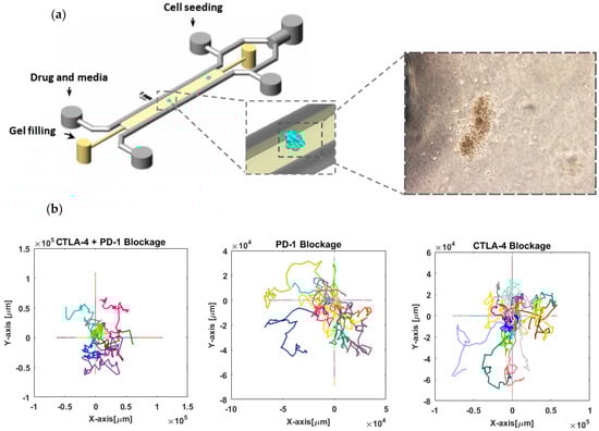 Tracking lymphocyte migration in 3D organotypic tumor culture. (a) Schematic view of the microfluidic device used for 3D culture of thyroid tumor spheroids (scale bar shows 1 mm). Patient-derived tumor spheroids containing autologous immune cells were loaded in a collagen medium in the central channel of the device and subjected to anti-PD-1 or anti-CTLA-4 antibody treatment. A representative bright-field image of a thyroid tumor spheroid shows cells migrated into the surrounding collagen. (b) Cell trajectories in three different conditions of pathway inhibition. A total of 12, 28, and 9 migrating cells were tracked in the conditions of anti-PD-1, anti-CTLA-4, and combination exposure, as indicated. For each experiment, individual trajectories are shown with distinct colors, and all trajectories started from the same point (coordinate center) that is overlaid on the same graph. Time-lapse images were captured every 15 min for at least 130 h.