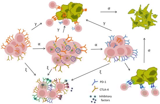 It is assumed that all three subpopulations of active lymphocytes may be deactivated by CTLA-4 receptors at a rate, along with inhibitory factors other than PD-1 and CTLA-4 (i.e., radical formation and hypoxia) with a rate of performance. The PD-1 signaling pathway can exclusively inhibit cells in the full expression state of PD-1 . The cytotoxic activity of lymphocytes’ total population causes the death of tumor cells at a rate of (Equation (6)).