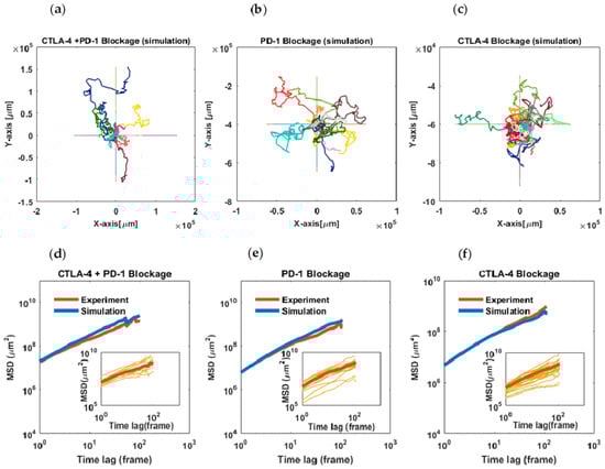 Statistical analysis of cell migration and AR-1 model evaluation. (a–c) Simulated trajectories using the AR-1 model with time-dependent parameters (activity and persistence) based on single-cell parameter changes estimated from experimental data. (d–f) Mean-square displacements (population-averaged) of tumor-infiltrating lymphocytes treated with anti-PD-1 or anti-CTLA-4 antibodies or a combination thereof (red curves). The MSDs show sub-diffusive behavior with an approximate power-law exponent of 0.83 for PD-1, 0.93 for CTLA-4, and 0.98 for combined inhibition. Blue curves represent the MSDs of simulated trajectories for each experiment. The intercepts of the curves indicate the highest value of the cell diffusion coefficient in the combined treatment (D = 7.3). The AR-1 model with changing parameters effectively reproduces the experimental MSDs obtained in each condition. Insets: MSD curves for individual cells. The last steps of the migration trajectories were removed because of error amplification in MSD calculations.