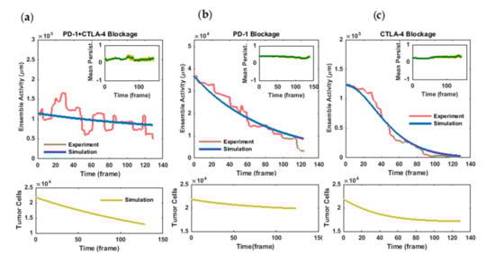 Temporal variation in immune cell activity and dynamical model simulation in (a) combined as well as individual blockade of (b) PD-1 and (c) CTLA-4 pathways. Immune cell activity displays a much lower initial value in PD-1 blockade compared with the two other conditions. Contrary to PD-1 blockade, the decrease in cellular activity in CTLA-4 blockade entails a delay of several hours, while in the combined inhibition of the pathways, the cells remain active up to the last frames of the assays. Dynamical model parameters were inferred by fitting the model (blue curves) to immune activity changes derived from cell migration data (pink curves). Tumor–immune profiling of the spheroids and live/dead cell staining confer an initial value of and final values of , , and for the tumor cell population (yellow curves). Simulation results with the specified parameter set (σ = 0.00000022, ξ = 0.000000137, γ = 0.0000024, α = 0.0549, and β = 0.000016; all in a temporal unit of time step) show good agreement with the relative tumor-killing performance of anti-PD-1 and anti-CTLA-4 components according to cell death assessments in tumor spheroids. No unit is considered for cellular activity. Inset: Population-averaged persistence of immune cell migration in checkpoint inhibition experiments. The average values of the persistence parameter show moderate changes over time in the experiments. Error bar corresponds to standard error.