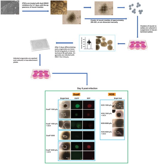 HiPSCs were resuspended in mTeSR1-plus medium supplemented with Rho-associated protein kinase inhibitor (ROCK inhibitor) Y27632 (STEMCELL Technologies; Vancouver, BC, Canada) and dual-SMAD inhibitors SB431542 10 µM (MilliporeSigma; St. Louis, MO, USA; S4317-5MG) and LDN193189 100 nM (Millipore Sigma; St. Louis, MO, USA; SML055-9-25MG) and seeded on Matrigel-coated plates at the density of 106 cells/well. The day after, the ROCK inhibitor was withdrawn from the neural induction medium. Culture medium was changed every day. In these culture conditions, neural rosettes make their appearance starting from day 5–7. Clusters of neural rosettes of approximately 200–300 μm were dissected manually, transferred into ultra-low attachment plates, and cultured in neural induction medium. After 2–3 days, early-stage organoids derived from cluster of neural rosettes were transferred singularly into low-attachment 96-well plates and infected as follows. Organoids were washed with 100 µL of DMEM-F12 medium. The medium was then discarded, and 10 µL of neurobasal medium with or without ACV containing 1000 pfu of HSV-1 was added. The organoids were cultured in an incubator under standard conditions (5% CO2, 37 °C, and 100% humidity). Two hours after the infection, the inoculum was removed, the organoids washed twice with 100 µL of DMEM-F12 medium and cultured in 5 cm petri dishes in the presence or absence of ACV.