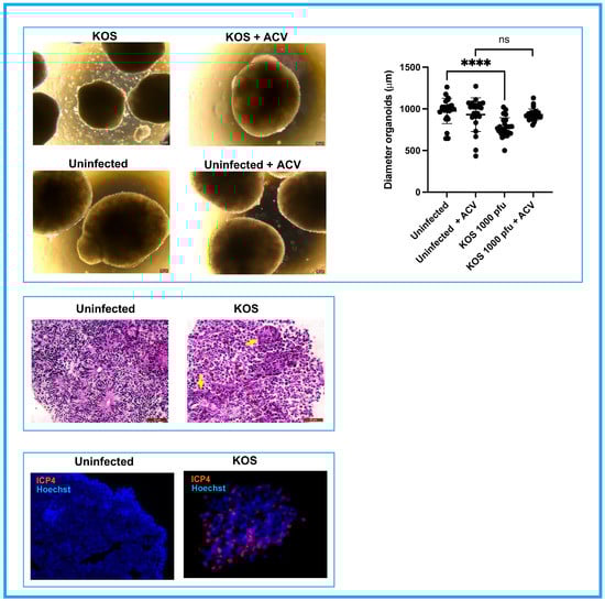 On day 15 p.i., the infected organoids exposed to ACV began to also show signs of a loss of structural integrity (Figure 2) and reduced size when compared with uninfected organoids exposed to ACV; however, this reduced size did not reach statistical significance. A significant reduction in diameter of infected organoids when compared with uninfected organoids cultured in the presence of ACV (p = 0.0002) was observed at day 20 p.i. (Figure 4), indicating a reduction of the ability of the differentiating cells to proliferate.