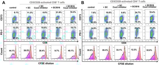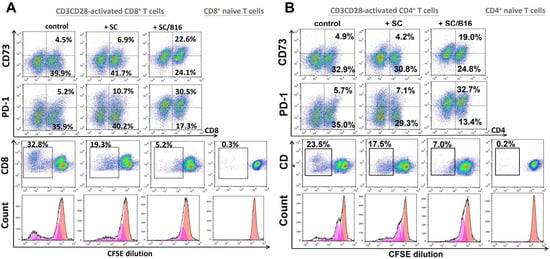 We tested the impact of SC on T cell polarization by assessing expression of markers associated with T cell exhaustion, including PD-1, CD73, and CD39 [23,24]. We revealed that tumor-treated SC significantly up-regulated the expression of CD73 and PD-1 on CD8+ and CD4+ T cells up to 5–6 times (Figure 1 upper panels) but did not alter the expression of CD39 on T cells (Figure S5). For instance, while non-activated SC increased expression of CD73 on CD8+ T cells from 6.2 ± 0.9% to 9.4 ± 1.8%, tumor-activated SC up-regulated it to 26.5 ± 3.4% (p < 0.05). Expression of PD-1 on CD8+ T cells was increased from 8.6 ± 1.2% to 15.8 ± 2.2% by control SC and to 38.6 ± 6.3% by tumor-treated SC (p < 0.05). Similar up-regulation of CD73 and PD-1 was seen in CD4+ T lymphocytes. Remarkably, tumor-treated SC significantly suppressed the inducible proliferation of CD8+ and CD4+ T cells up to five folds (Figure 1, lower panels), suggesting their functional impairment, which may be associated with the exhausted phenotype. These results suggest tumor-activated SC can change both the function and phenotype of T lymphocytes, posing a question about SC factors responsible for this new phenomenon.