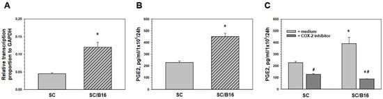 Total RNA from control SC and SC treated with B16-conditioned medium was prepared using the Rneasy kit (Qiagen, Hilden, Germany). For reverse transcription, 1 µg of total RNA was primed with oligoDT (Roche Applied Science, Basel, Switzerland) for 10 min at 65 °C prior to the generation of cDNA via the addition of a master mix of reverse transcriptase 200 units MMLV-RT (Gibco/ThermoFisher Scientific), 1 mM dNTP (Promega, Madison, WI, USA) and 10 mM dithiothreitol per reaction for 1 h at 42 °C. The cDNA was then utilized for qPCR using standard qPCR procedures with the specific primers for COX2: Forward Primer AACCCAGGGGATCGAGTGT, Reverse Primer CGCAGCTCAGTGTTTGGGAT (IDT Integrated DNA Technologies, Coralville, IA, USA). GAPDH (Forward Primer AGGTCGGTGTGAACGGATTTG, Reverse Primer TGTAGACCATGTAGTTAGTTGAGGTCA) transcript was used as an internal control. Quantitative PCR on a Stratagene MX3000P procedure utilized SYBR green to monitor DNA synthesis. Reactions were run in triplicates in 25 µL reaction volume with 12.5 µL of SYBR master mix, 250 nM primers, and 1 µL of first strand cDNA. After 10 min at 95 °C, amplification involved 30 cycles of 30 sec at 95 °C, 30 sec at 56 °C and 1 min at 72 °C. The results are presented as relative transcription proportion to GAPDH.