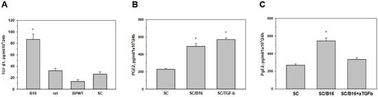SC (1 × 105/mL, 12-well plates) were pre-treated for 2 h with 10 µM COX-2 inhibitor (CAS 181696-33-3, Calbiochem, San Diego, CA, USA), 10 µM TGF-βR1/ALK4/5/7 inhibitor (SB431542, MilliporeSigma), 10 µM MAPK/ERK inhibitor (UO126, Cell Signaling Technology) or medium served as a control. Medium was removed and SC were treated with tumor-conditioned medium (10% v/v), control medium or rTGF-β1 (100 pg/mL, Cell Signaling Technology, Danvers, MA, USA) for 24 h. To block the TGF-β1 activity, 10 μg/mL anti-TGF-β1-neutralizing antibody (R&D System, Minneapolis, MN, USA) was added at the beginning of stimulation. Medium was removed and replaced with complete medium (2% FBS) for additional 24-h incubation. Cell-free supernatants were collected by centrifugation at 700× g for 5 min. PGE2 concentration (Cayman Chemical, USA) was measured in supernatants by ELISA.