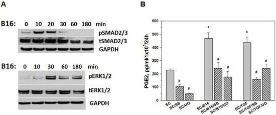 TGF-β transduce intracellular signals by SMAD2 and SMAD3 proteins. TGF-β also induces non-SMAD signaling pathways, and at the intracellular signaling and transcription level, the ERK1/2 and SMAD pathways often associate with each other regulating the specific target genes in different cell types [3,31]. Analysis of these pathways in B16-activated SC revealed their role in mediating PGE2 production (Figure 5). First, Western blot analysis indicated that the level of the phosphorylation of SMAD 2/3 and ERK1/2 increased significantly in SC treated with tumor-conditioned medium (Figure 5A). Quantification of Western blots confirmed up-regulation of pSMAD2/3 and pERK1/2 up to 30 folds within 10 and 30 min, compared to tSMAD2/3 and tERK1/2, respectively (p < 0.001) (Figure S6). To prove that both canonical and non-canonical pathways in SC mediate PGE2 production induced by tumor treatment, we used SB431542, a selective inhibitor of the TGF-βRI/ALK4/5/7 canonical pathway, and UO126, a selective inhibitor of MAPK/ERK kinase, to treat SC prior to activation with B16-conditioned medium. MAPK/ERK kinase (MEK) is a major regulator of ERK1/2 signaling and can activate ERK1/2 transiently or persistently. Importantly, SB431542 has no effect on components of the ERK pathway. Results shown in Figure 5B indicate that both inhibitors significantly attenuated PGE2 production by SC induced by both B16 and TGF-β (p < 0.01). Together, our results suggest that tumor-derived TGF-β may activate SMAD and MAPK/ERK signaling pathways in SC, resulting in significant up-regulation of PGE2 production and release, inducing the exhaustion of T cells.