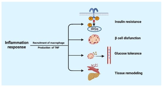 Pro-inflammatory cytokines promote the recruitment the macrophage and secretion of TNF to act on metabolic diseases including insulin resistance, β cell dysfunction, impaired glucose tolerance, and tissue remodeling. TNF: tumor necrosis factor. The figure was constructed with BioRender (https://biorender.com, accessed on 7 September 2022).