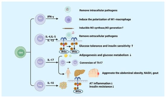 CD4+ T cells are important in metabolic diseases. Functionally, CD4+ T cells are also known as Th cells. Under the stimulation of different antigens and cytokines, CD4+ T cells can differentiate into four subsets, including Th1, Th2, Th17, and inducible regulatory T (iTreg) cells [52,53]. Th1 cells, which secret IFN-γ, exert the function of helper cellular immunity against intracellular pathogens and viruses, and contribute to the progression of chronic inflammatory diseases [54]. Th2 cells secrete cytokines such as IL-4, IL-5, and IL-13, which promote the proliferation and differentiation of B cells, assist humoral immunity, eliminate extracellular pathogens, and play a role in allergic inflammation [55]. Th17 cells can eliminate extracellular pathogens. Similar to Th1 cells, Th17 cells promote progression of inflammation [56]. Treg cells including iTreg and nTreg inhibit inflammatory response by secreting cytokines interculin-10 (IL-10) and transforming growth factor-β (TGF-β) [55]. Generally, Th1 and Th17 cells play a critical role in promoting pro-inflammatory responses, whereas Th2 and Treg cells are highly correlated with anti-inflammatory responses [57,58] (Figure 3).