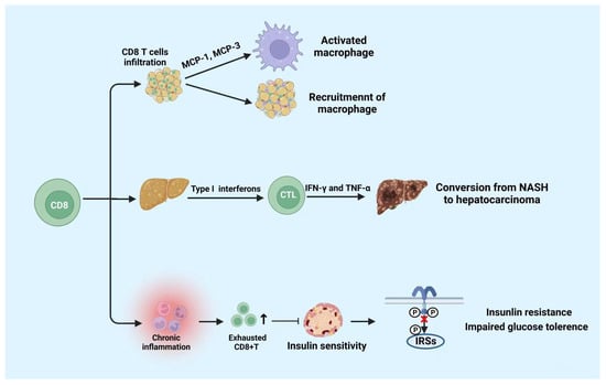 CD8+ T cells play a role in pro-inflammatory activities. CD8+ T cells infiltration promotes the activation and recruitment of macrophages. Moreover, CD8+ T cells infiltration in liver tissue is beneficial to the conversion from NASH to hepatocarcinoma. Moreover, cumulated exhausted CD8+ T cells suppress the insulin sensitivity which leads to insulin resistance and impaired glucose tolerance. NASH: non-alcoholic steatohepatitis. The figure was constructed with BioRender (https://biorender.com, accessed on 7 September 2022).