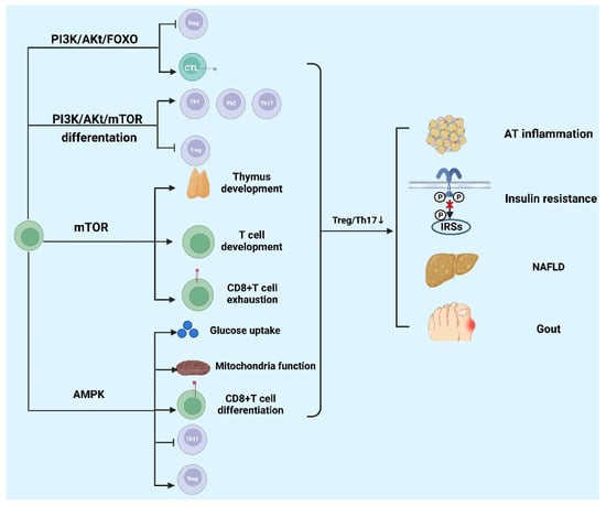 The signaling pathways regulating T cells in metabolic diseases. PI3K/Akt/mTOR signaling pathway promotes the differentiation of CD4+T cells. mTOR signaling pathway takes part in the development of thymus and T cells and the exhaustion of CD8+T cells. PI3K/Akt/FOXO suppresses the development of Tregs and promotes the expression of cytotoxicity effector. AMPK signaling pathway negatively regulates Th17 differentiation, glucose uptake, mitochondria function, and CD8+T cell differentiation, whereas the pathway positively regulates Treg cells’ differentiation. These pathways could regulate the ratio of Treg to Th17 together. The decrease in the ratio leads to AT inflammation, insulin resistance, NAFLD, and gout. PI3K: phosphatidylinositol 3-Kinase; Akt: protein kinase B; mTOR: mammalian target of rapamycin; AMPK: Adenosine 5‘-monophosphate (AMP)-activated protein kinase; NAFLD: non-alcoholic fatty liver disease. The figure was constructed with BioRender (https://biorender.com, accessed on 7 September 2022).
