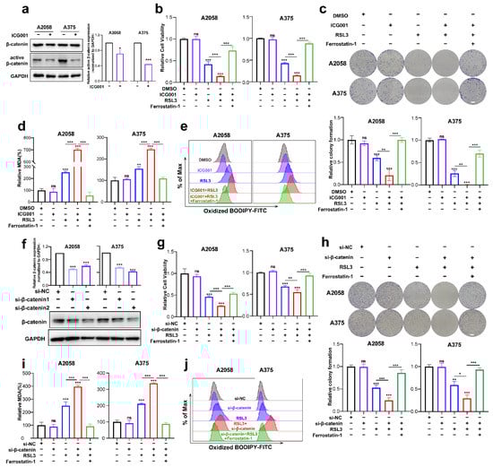 The next step was to investigate if Wnt/β-catenin signaling modulates ferroptosis. First of all, we tested the inhibitory influence of the pharmacological inhibitor ICG001 at different concentrations on the cell viability of A2058 and A375 melanoma cells and found that ICG001 at a concentration of more than 6 μM was capable of inducing prominent suppression of cell viability (Supplementary Figure S1a). Meanwhile, ICG001 at a concentration of 6 μM could suppress the expression of active-β-catenin in melanoma cells, where it had no impact on the total β-catenin expression (Figure 2a). As revealed by the CCK8 assay, though ICG001 monotreatment showed marginal influence, RSL3 was capable of inducing prominent suppression of colony formation and cell viability (Figure 2b,c). Moreover, the combination of ICG001 and RSL3 could induce additional attenuation of the viability of cells and the formation of a colony in the melanoma cell lines A2058 and A375, which could be almost reserved by ferrostatin-1 (Figure 2b,c). One unique characteristic of ferroptosis is the production of excessive lipid peroxidation [30], and one of lipid peroxidation’s most significant end products is MDA. Therefore, we wondered whether Wnt/β-catenin signaling affects ferroptosis via the regulation of MDA. As shown, RSL3 treatment could significantly enhance intracellular MDA, whereas ICG001 cotreatment could potentiate MDA accumulation (Figure 2d). In line with this, lipid ROS identified through flow cytometry with the employment of the C11-BODIPY probe also exhibited that the combined administration of ICG001 and RSL3 could facilitate the generation of lipid ROS and thereby lipid peroxidation (Figure 2e). Apart from the pharmacological inhibition of β-catenin, we also employed genetic knockdown of β-catenin to examine the influence of β-catenin on melanoma cell ferroptosis (Figure 2f). In light of what CCK8 revealed, the knockdown of β-catenin expression could potentiate RSL3-induced suppression of cell viability, and ferrostatin-1 may be able to reverse this phenomenon (Figure 2g). Meanwhile, colony formation assays also revealed that β-catenin expression deficiency exacerbated RSL3-induced ferroptosis, and ferrostatin-1 may also be able to reverse this event (Figure 2h). In consistency with this, β-catenin expression deficiency facilitated the generation of MDA and lipid ROS in response to RSL3 administration in the A2058 and A375 melanoma cell lines (Figure 2i,j). Therefore, inhibiting Wnt/β-catenin signaling could exacerbate RSL3-induced cell death in a manner dependent on ferroptosis via the facilitation of lipid peroxidation generation.