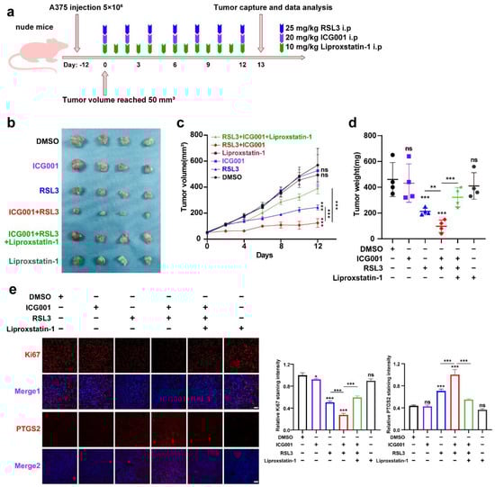 Targeting Wnt/β-catenin signaling exacerbates melanoma cell ferroptosis in vivo. (a) An illustration of the treatment strategy. (b–d) Captured images of isolated tumors in xenografted mice receiving the indicated treatments. Tumor volume and weight were calculated for each group, as shown in the right panel. (e) IF staining of PTGS2 and Ki67 in isolated xenograft tumors. Scale bar = 50 μm. Data are presented as mean ± SEM of triplicates. p-value was computed using a two-tailed Student’s t-test. * p < 0.05, ** p < 0.01 and *** p < 0.001. ns, nonsignificant.