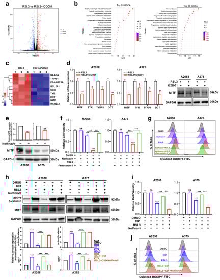 MITF mediates the influence of Wnt/β-catenin signaling on melanoma cell ferroptosis. (a) Volcano map displaying the differentially expressed genes between the RSL3 monotreatment group and the RSL3+ICG001 combined treatment group in the A2058 melanoma cell line. (b) The GSEA analysis displays the pathways enriched by differentially expressed molecules between the RSL3 monotreatment group and the RSL3+ICG001 combined treatment group. NES (normalized enrichment score). (c) Heatmap displaying that MITF and its downstream targets are differentially expressed between the RSL3 monotreatment group and RSL3+ICG001 combined treatment group. (d) Relative mRNA levels of MITF, TYR, TYRP1 and DCT, as well as protein levels of MITF, in the melanoma cell lines A2058 and A375, between the RSL3 monotreatment group and the RSL3+ICG001 combined treatment group. (e) Immunoblotting analysis of MITF after the treatment with 5 μM nelfinavir for 24 h in the melanoma cell lines A2058 and A375. (f) Relative cell viability after the indicated treatment for 24 h (RSL3, 2 μM for A2058 and 0.5 μM for A375; 5 μM nelfinavir and 10 μM ferrostatin-1 for both A2058 and A375). (g) Lipid ROS levels of indicated cells were detected utilizing flow cytometry and employing C11-BODIPY. (h) Immunoblotting analysis of active β-catenin and MITF after the indicated treatment for 24 h (RSL3, 2 μM for A2058 and 0.5 μM for A375; 5 μM nelfinavir and 5 μM C91 for both A2058 and A375). (i) Relative cell viability after the indicated treatment in the melanoma cell lines A2058 and A375. (j) Lipid ROS levels of indicated cells were measured utilizing flow cytometry and employing C11-BODIPY. Data are presented as mean ± SEM of triplicates. p-value was computed using a two-tailed Student’s t-test. * p < 0.05, ** p < 0.01 and *** p < 0.001. ns, nonsignificant.