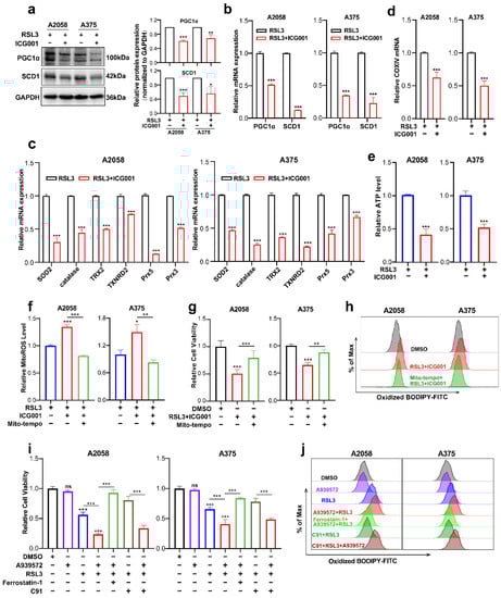 PGC1α and SCD1 are two main effectors downstream of the Wnt/β-catenin-MITF pathway in melanoma cell ferroptosis. (a,b) Immunoblotting and qRT-PCR analysis of PGC1α and SCD1 levels in the melanoma cells between the RSL3 monotreatment group and RSL3 plus ICG001 combined treatment group (RSL3, 2 μM for A2058 and 0.5 μM for A375 for 24 h. 6 μM ICG001 for both A2058 and A375 for 24 h). (c,d) qRT-PCR analysis of a panel of antioxidant enzymes and COXIV in the melanoma cells with the indicated treatment for 24 h (RSL3, 2 μM for A2058 and 0.5 μM for A375; 6 μM ICG001 for both A2058 and A375). (e,f) The level of mitoROS and intracellular ATP in A2058 and A375 with the indicated treatment for 24 h (RSL3, 2 μM for A2058 and 0.5 μM for A375; 6 μM ICG001 and 10 μM Mito-tempo for both A2058 and A375). (g) Relative cell viability of melanoma cell lines receiving the following treatment: RSL3, 2 μM for A2058 and 0.5 μM for A375, 6 μM ICG001 and 10 μM Mito-tempo for both A2058 and A375. (h) Lipid ROS levels of indicated cells were detected utilizing flow cytometry and employing C11-BODIPY which is related to (g). (i) Relative cell viability of both A2058 and A375 melanoma cell lines receiving a treatment with 2.5 μM A939572, RSL3 (2 μM for A2058 and 0.5 μM for A375), 10 μM ferrostatin-1 and 5 μM C91 for 24 h. (j) Lipid ROS levels of indicated cells measured utilizing flow cytometry and employing C11-BODIPY that is related to (i). Data are presented as mean ± SEM of triplicates. p-value was computed using a two-tailed Student’s t-test. * p < 0.05, ** p < 0.01 and *** p < 0.001. ns, nonsignificant.