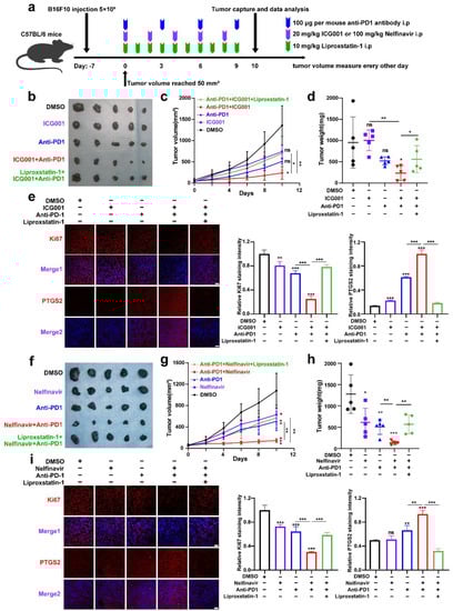 Treatment of melanoma with anti-PD-1 immunotherapy is significantly effective, while poor responsiveness and resistance to the treatment considerably reduce its effectiveness [45]. A previous report has revealed that the melanoma cell-intrinsic Wnt/β-catenin signaling activation is associated with the nonexistence of a T-cell gene expression signature, rendering the resistance to anti-PD-L1/anti-CTLA-4 monoclonal antibody treatment [46]. Moreover, pharmacological Wnt ligand inhibition promotes anti-PD-1 effectiveness via reversing dendritic cell tolerization and the recruitment of granulocytic myeloid-derived suppressor cells in tumor models [47]. These reports have mainly emphasized the regulatory influence of tumorous Wnt/β-catenin signaling on surrounding immune cells in the tumor microenvironment (TME). Since that IFN-γ derived from activated CD8+ T-cells in TME can trigger tumor cell ferroptosis upon anti-PD-1 antibody treatment, and targeting Wnt/β-catenin signaling can exacerbate ferroptosis according to our results, we proposed that targeting Wnt/β-catenin might increase the effectiveness of anti-PD-1 antibody by the induction of tumor cell ferroptosis. To produce a xenograft tumor model, B16F10 mouse melanoma cells were injected subcutaneously into immune-competent C57BL/6 mice (Figure 6a). As shown, anti-PD-1 antibody treatment resulted in slight tumor regression, which was forwardly suppressed after the coadministration with Wnt inhibitor ICG001 (Figure 6b–d). This combined influence was abolished by the ferroptosis inhibitor liproxstatin-1 treatment, indicating that targeting Wnt/β-catenin can enhance the effectiveness of anti-PD-1 antibody through the ferroptosis induction (Figure 6b–d). In isolated tumors, simultaneous IF staining analysis of PTGS2 discovered that the combination of anti-PD-1 antibody and ICG001 indeed induced more tumor cell ferroptosis, and liproxstatin-1 coadministration could suppress the synergized therapeutic influence (Figure 6e). In parallel, the staining intensity of Ki67 was substantially reduced after the combined treatment with both anti-PD-1 antibodies and ICG001, and liproxstatin-1 may be able to reverse this phenomenon (Figure 6e).