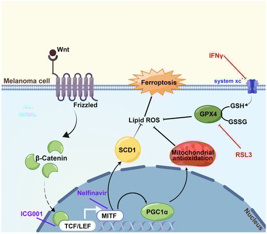 A proposed model of the function of the Wnt/β-catenin-MITF pathway in ferroptosis in melanoma. The activation of Wnt/β-catenin signaling can promote the transcription of MITF, leading to the upregulation of downstream PGC1α and SCD1, so that the generation of lipid peroxidation is prominently suppressed and ultimately ferroptosis is inhibited. Wnt/β-catenin signaling deficiency exacerbates ferroptosis in melanoma via the regulation of MITF. This figure was produced by Figdraw.