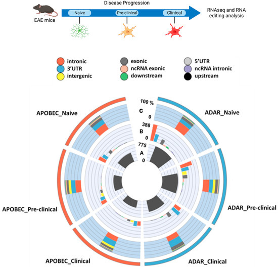 RNA editing is reduced in murine microglia and shifts towards 3′UTR in clinical disease. Graphic representation of murine microglia RNA editomes, following EAE induction. Presented data are based on meta-analysis of previously published RNA-seq data (GSE59725, [36]), following an in-house developed pipeline for RNA editing events identification. Ring A: Absolute number of RNA editing events identified per editing-mediating enzyme and time-point (naïve, pre-clinical, clinical). Both ADAR- and APOBEC-mediated editing were reduced as disease progressed (for detailed numbers, please also see Tables S2–S4). Ring B: Genomic distribution (color code legend on top of the graph) of RNA editing events (absolute numbers) for each RNA-editing mediating enzyme and time-point. A shift towards increased 3′UTR editing was observed as disease progressed. Ring C: Percent genomic distribution of editing events across functional gene regions (color code legend on top of the graph). For a detailed list of editing events identified per editing enzyme and time-point, please refer to Supplementary Files S1 and S2. Top panel figure created in Biorender.com (accessed on 9 September 2022).