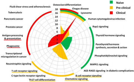 RNA editing occurs at microglial transcripts involved in differential signaling under normal (naïve) and EAE (pre-clinical, clinical) conditions. Visualization of pathway analysis (KEGG 2019 mouse database, through Enrichr, https://amp.pharm.mssm.edu/Enrichr/ (accessed on 20 September 2017)) performed on edited targets at each time-point. The graph provides the enrichment (-log10(p-value)) of the top 10 pathways identified per condition (ranked based on p-value). Three pathways (‘Osteoclast differentiation’, ‘Chagas disease’, ‘Lysosome’) are commonly identified in all three conditions. Among these, the pathway ‘Lysosome’ is over-represented in clinical disease. Microglia response signaling pathways are enriched in pre-clinical disease, while in clinical disease, the pathways ‘Antigen processing and presentation’ and ‘Phagosome’ are also enriched. For detailed illustrations of the 60 most enriched RNA-edited transcripts in corresponding pathways and time-points, refer to Figures S3–S5. Editing events occurring at intergenic regions were not included in this pathway analysis.