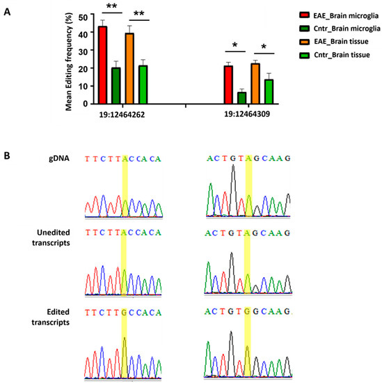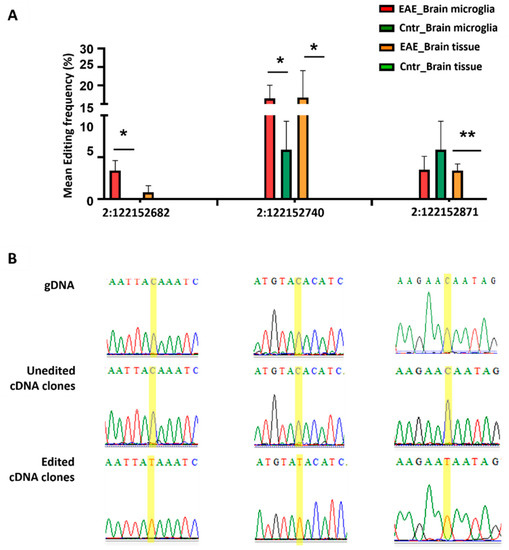 Recent reports provide accumulating evidence on the involvement of RNA editing alterations in brain disorders, including neurodegenerative [18,19,43], neurological [13,14,44], and autoimmune diseases [45,46,47]. Extending our previous research in this field, the present study focused on EAE, as a representative of demyelinating disorders entailing autoimmune responses, inflammation, and degeneration.