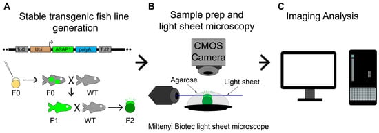 Overall experimental procedure. (A) Illustration of a Tol2 construct, the method to produce stable ASAP1 zebrafish line, Tg (ubi: ASAP1), and zebrafish crosses. X indicates fish cross. Black arrows show fish raising or producing. The green color labels the ASAP1 transgene. (B) Experimental setup to image zebrafish Tg (ubi: ASAP1) embryos with Miltenyi Biotec light sheet ultramicroscope II. ASAP1-positive embryos were mounted in agarose on a platform to keep them stable during imaging. (C) Image analysis was performed using ImageJ (v1.53e) and Imaris programs (9.7.2, Bitplane AG).
