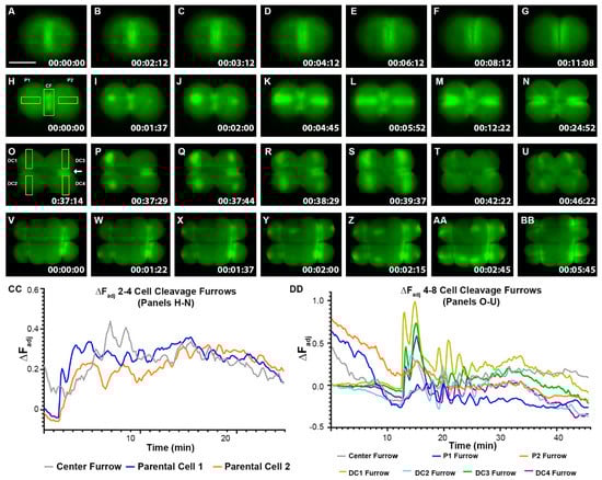 Zebrafish Cleavage period embryos display furrow-related dynamic hyperpolarization. (A–BB) Still-frame representative max-projection images from time-lapse videos (Supplementary Video S1–S3). 1–16 cell stages of Tg (ubi: ASAP1) zebrafish embryos were imaged from the animal pole position. (A–G) Representative Vm images from 1–2 cell stage fish embryo. (H–U) Representative Vm images from 2–8 cell stage fish embryo. (V–BB) Representative Vm images from an 8–16 cell stage fish embryo. Areas of bright green indicate hyperpolarization. Yellow boxes show regions of interest (ROIs) for measuring fluorescence intensity over time. The white arrow in (O) points to the P2 furrow signal. Signals appeared before cleavage furrows formed and then fluctuated as cytokinesis progressed. (CC) Adjusted fluorescence intensity, ∆FAdj, of ROIs in panels (H–N). (DD) Adjusted fluorescence intensity, ∆FAdj, of ROIs in panels (O–U). All lines in panels (CC,DD) represent the change in adjusted fluorescence intensity of ROIs for the designated cleavage furrows over time. CF (center furrow), a fertilized embryo’s initial division plane. P1, parental cell one. P2, parental cell two. DC1, daughter cell one. DC2, daughter cell two. DC3, daughter cell three. DC4, daughter cell four. Time (lower right corner), hours: minutes: seconds. Scale Bar= 250 µm.