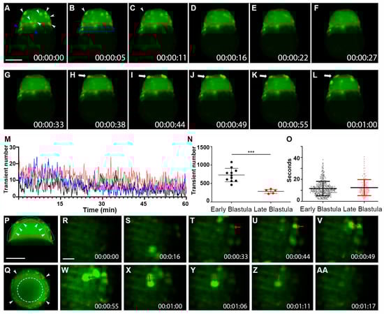 Whole-cell Vm transients occurred in the zebrafish superficial blastomeres during the blastula period. (A–L) Still-frame representative max-projection images from a time-lapse video (18 min total time, 5.5-s intervals, Supplementary Video S5). Early-stage blastula of the Tg (ubi: ASAP1) zebrafish embryo was imaged from a lateral position. (A) White arrowheads indicate whole cells that were hyperpolarized. Blue arrowheads point to Vm signals in YSL. (B) The blue dashed line indicates the YSL region of cells. Arrowheads in panels (B,C) show the same cell with signal fading over time. (H–L) White arrows show a cell that became hyperpolarized and eventually faded after about 20 s. (M) Average number of transients occurred at a given time point from a 60 min acquisition. The total number of hyperpolarized cells fluctuated over time. Each colored line indicates different fish embryos. (N) The total number of Vm transients occurred within the early (2.5–3.5 h) and the late (3.5–4.5 h) blastula (n ≥ 5 embryos for each group). Asterisks indicate a statistical significance of p < 0.001. (O) Vm transient duration of the early (2.5–3.5 h n = 4) and the late (3.5–4.5 h n = 3) blastula. (P) Max time projection (t = 2 min) of a 3.5 h blastula embryo imaged with a single Z-plane through the center (lateral position). Arrowheads point to the hyperpolarized cells only appearing within the superficial blastomere (Supplementary Video S6). A White dashed line indicated the EVL region of the embryo. (Q) Max time projection (t = 3 min) of a 3.5 h blastula embryo imaged with a single Z-plane through the center (animal pole position). Arrowheads point to the hyperpolarized cells only appearing within the superficial blastomere. The white segmented circle in the center of the blastula contains no hyperpolarized cells. Scale Bar= 250 µm. (R–AA) Early-stage blastula embryo (3 hpf) zoomed still-frame images from a time-lapse video (1 min 17-s total time, Supplementary Video S7). Red arrows indicate whole cells that were hyperpolarized. (U) The red arrow points to a strongly hyperpolarized cell. (V) The red arrow points to an adjacent cell that signaled 5 s later. (W) The red arrow points to a new adjacent cell signaled after another 5.5 s. This pattern continued, with the arrow in panel (X) pointing to another new adjacent cell from panel (W) This pattern finally dissipated with the earlier signaling cells fading. Eventually, the last signaling cell in panel (X) faded in (AA). Time (lower right corner), hours: minutes: seconds. Scale Bar= 50 µm.