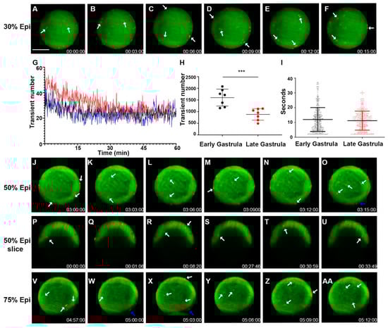 When the fish embryos develop to the gastrula period, we chose imaging with longer total times and intervals to capture an overall picture of Vm dynamics during this stage. Time-lapse imaging revealed a continuation of Vm transients within the early stages of gastrulation (4.5–6 h or 30% epiboly to shield) and within the later stages (6–8 h or shield to 75% epiboly) (Figure 4A–AA, Supplementary Video S8). Early gastrulation period Vm transients frequently fluctuated as in the blastula period. However, the number of Vm transients increased without the Vm transient duration being significantly affected (Figure 4G–I vs. Figure 3M–O). Since Vm transients were only observed within the EVL (enveloping layer) and YSL (yolk syncytial layer) during the blastula stage, we decided to check if this held true during the gastrula period, in which the three germ layers are formed by dynamic cell movements and internalizations. Indeed, we found signaling within the deep cells during the gastrula period, starting at around 30% epiboly (Supplementary Video S2). We could also detect Vm signals occurring within layers deeper than the superficial blastomere (Figure 4P–U, Supplementary Video S9).