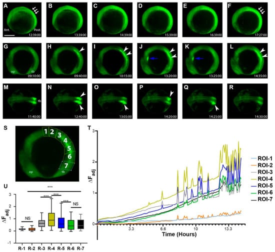 During the segment period, more complex and dynamic cellular bioelectric signals occurred at the tissue level. (A–F) Segmentation period (bud stage-6 somite stage, 1 h intervals, Supplementary Video S10). Somites and the posterior region of the embryo had an increased level of fluorescence. White arrows point to the somites. Note the relatively low fluorescent signals within the head region. (G–L) Left lateral time-lapse images of 10–16 somite zebrafish embryos (Supplementary Video S11). White arrowsheads point to the strong hyperpolarization of somites. Blue arrows point to Vm signals in the developing heart. (M–R) Dorsal view time-lapse images of 10–16 somite zebrafish embryos. White arrowheads indicate somite regions with strong hyperpolarization (Supplementary Video S12). (S) Embryo with positions of ROIs (1–7) used to calculate mean fluorescence and corresponding ∆FAdj. (T) ∆FAdj over time of ROIs in panel (S). All colored lines represent the change in fluorescence intensity of the designated ROI at each time point. Signals appeared to increase over time as somites became more developed. The number of fluctuations also increased as more somites were generated. (U) The mean ∆FAdj for each ROI for the entire duration of the time-lapse video. ROIs 1–2 showed the least amount of activity (most anterior somites), ROIs 3–5 showed the most activity (middle age somites), and ROIs 6–7 showed a moderate amount of activity (youngest somites/presomitic mesoderm/tailbud region). Asterisks indicate a statistical significance of p < 0.001. NS, not statistically significant. Scale Bar= 250 µm.