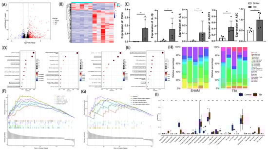 Gene expression analysis for TBI and control mice. Volcano plot of differential analysis (A). Heatmap of differential analysis (B). Comparison of TNF-α, IL-1β, IL-6, NLRP3, and ASC expression between TBI group and control group (C) (n = 5, Kruskal-Wallis test). Bubble chart of BP, CC, and MF analysis (D). Bubble chart of KEGG analysis (E). Enrichment plots for GO and KEGG items from gene set enrichment analysis (GSEA) (F,G). Heatmap of immune infiltration in sham and TBI groups (H). Violin plot of immune infiltration in sham and TBI groups (I). All data are shown as mean ± SD. * p < 0.05, ** p < 0.01.