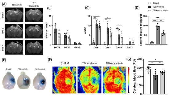 Through dynamic MRI observation on the 1st, 3rd, and 7th day after TBI, we found that the size of the trauma focus was gradually reduced in the first 7 days after TBI. Compared to the TBI group, the abrocitinib treatment significantly controlled the size of the trauma focus and enhanced the absorption of the hematoma (Figure 2A,B). The Evans blue dye extravasation test was performed on the 1st day after TBI. In the acute phase after TBI, the damage to the blood-brain barrier caused by TBI was significantly ameliorated by abrocitinib (Figure 2D,E). Moreover, drawing support from the results obtained using the non-invasive laser speckle imager, abrocitinib treatment significantly increased cortical cerebral blood flow (CBF) when compared to mice receiving saline (Figure 2F,G). On the one hand, all mice with TBI had severe unilateral sensorimotor deficits. On the other hand, a tendency for the mNSS to decrease over time after TBI was revealed. However, abrocitinib induced a significant decrease in the mNSS on the 3rd day after treatment when compared to the animals treated with saline, which indicated that the neurological function was apparently improved by the abrocitinib treatment (Figure 2C).