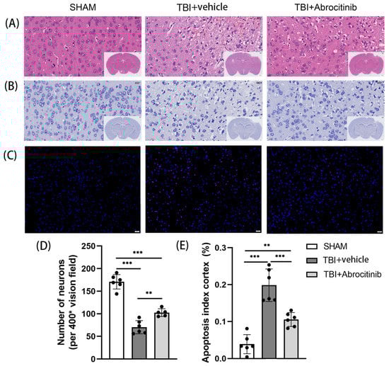 The mice were anesthetized with isoflurane. The FPI model was prepared as referenced in previous research []. Briefly, a 3-mm-diameter cavity with intact dura matter (2.0-mm posterior from the bregma and 2.0-mm lateral to the sagittal suture) was used to rapidly inject saline at a regulated pressure into an unrestrained mouse utilizing an FPI device (Custom Design & Fabrication, Richmond, VA, USA), the pressure of percussion was manipulated at 1.9 ± 0.2 atm. The sham group received the same process except for the strike procedure. The sham group and TBI group were administered saline via the intragastric route, and the treatment group was administered abrocitinib via the intragastric route after TBI.