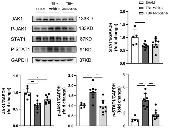 Effects of abrocitinib on the JAK1/STAT1 pathway. On the 1st day after TBI, JAK1 and STAT1 showed a dramatic increase in activation. After abrocitinib treatment, the activated JAK1 and STAT1 were significantly decreased, as shown in the WB results above and can be displayed through WB (n = 5–9, one-way ANOVA with Tukey’s post-hoc test). All data are shown as mean ± SD. * p < 0.05, ** p < 0.01, *** p < 0.001, **** p < 0.0001.