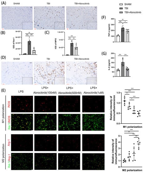 To observe the infiltration of inflammatory cells, IHC staining was performed to distinguish neutrophils and microglia (Figure 5A–D). The results of the IHC staining indicated that the number of neutrophils and microglia increased significantly in the acute phase after TBI. After abrocitinib intervention, the numbers of both types of inflammatory cells decreased significantly. Moreover, using surface markers specific for M1 and M2 in vitro, the state of microglial/macrophage polarization was detected. After abrocitinib treatment, the number of activated microglia/macrophages (Iba-1+) that expressed the M1 marker iNOS after LPS irritation markedly reduced, while the expressed M2 marker Arg-1 increased, indicating an M1-to-M2 transition. Moreover, this phenomenon became more apparent with the increasing dosage of abrocitinib (Figure 5E). TBI caused elevated pro-inflammatory factors in the brain tissue. We measured the levels of IL-6 and TNF-α in the brain tissues to investigate the role of the inflammatory response after TBI. When compared to the sham group, the ELISA results showed that TBI induced the secretion of these pro-inflammatory cytokines. On the other hand, abrocitinib could reverse the increased levels of IL-6 and TNF-α after TBI (Figure 5F,G).